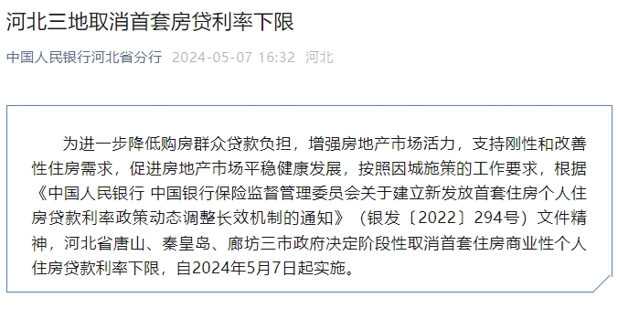 为进一步降低购房群众贷款负担,增强房地产市场活力,支持刚性和改善性住房需求,促进房地产市场平稳健康发展,按照因城施策的工作要求,根据《中国人民银行 中国银行保险监督管理委员会关于建立新发放首套住房个人住房贷款利率政策动态调整长效机制的通知》(银发〔2022〕294号)文件精神,河北省唐山、秦皇岛、廊坊三市政府决定阶段性取消首套住房商业性个人住房贷款利率下限,自2024年5月7日起实施。