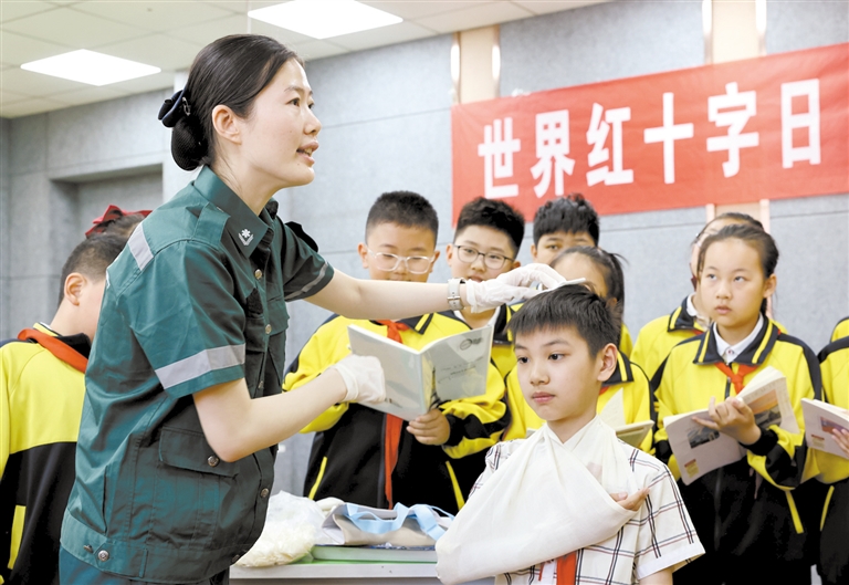 5月8日,在山东省枣庄市文化路小学,医务人员向学生传授急救知识。当日是世界红十字日,各地开展形式多样的活动,普及应急救护知识。 新华社发(孙中喆 摄)