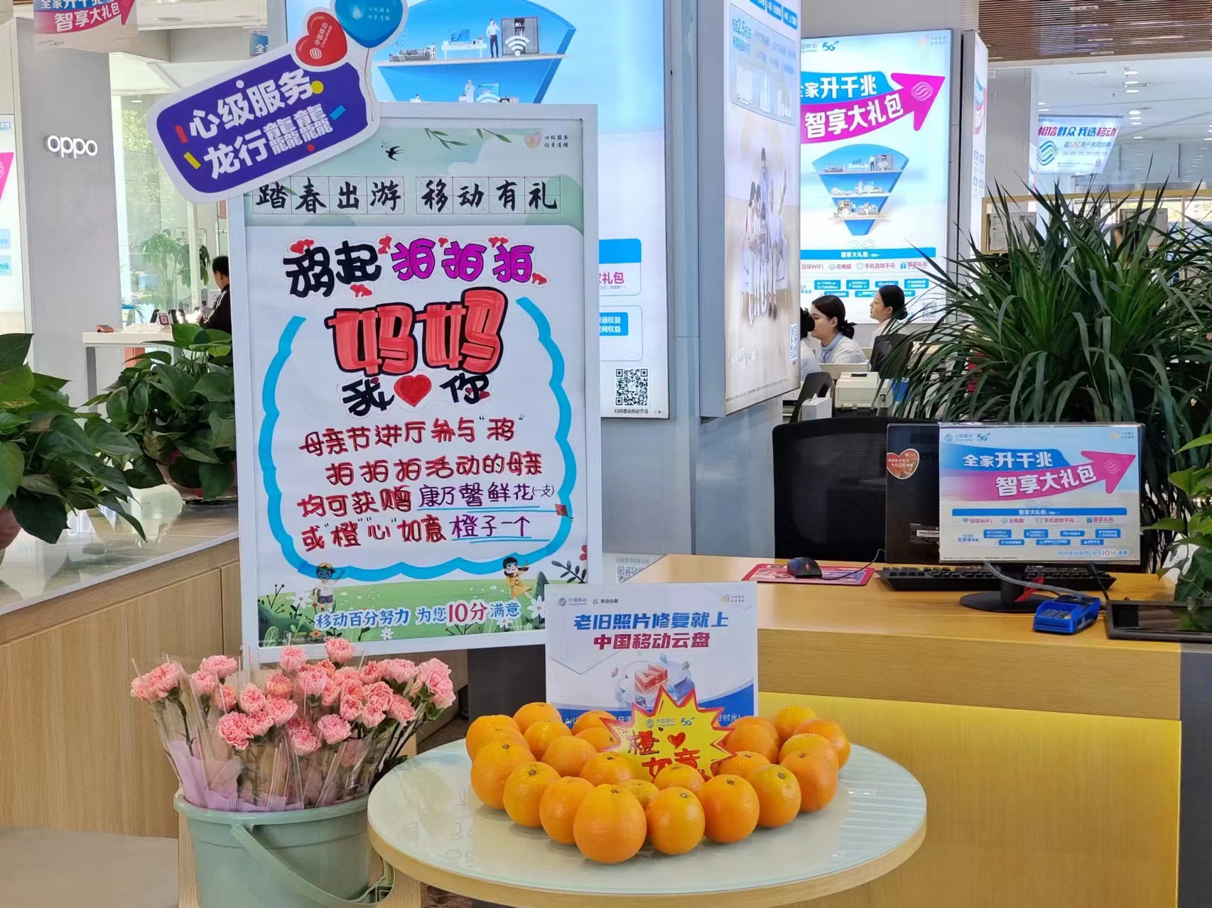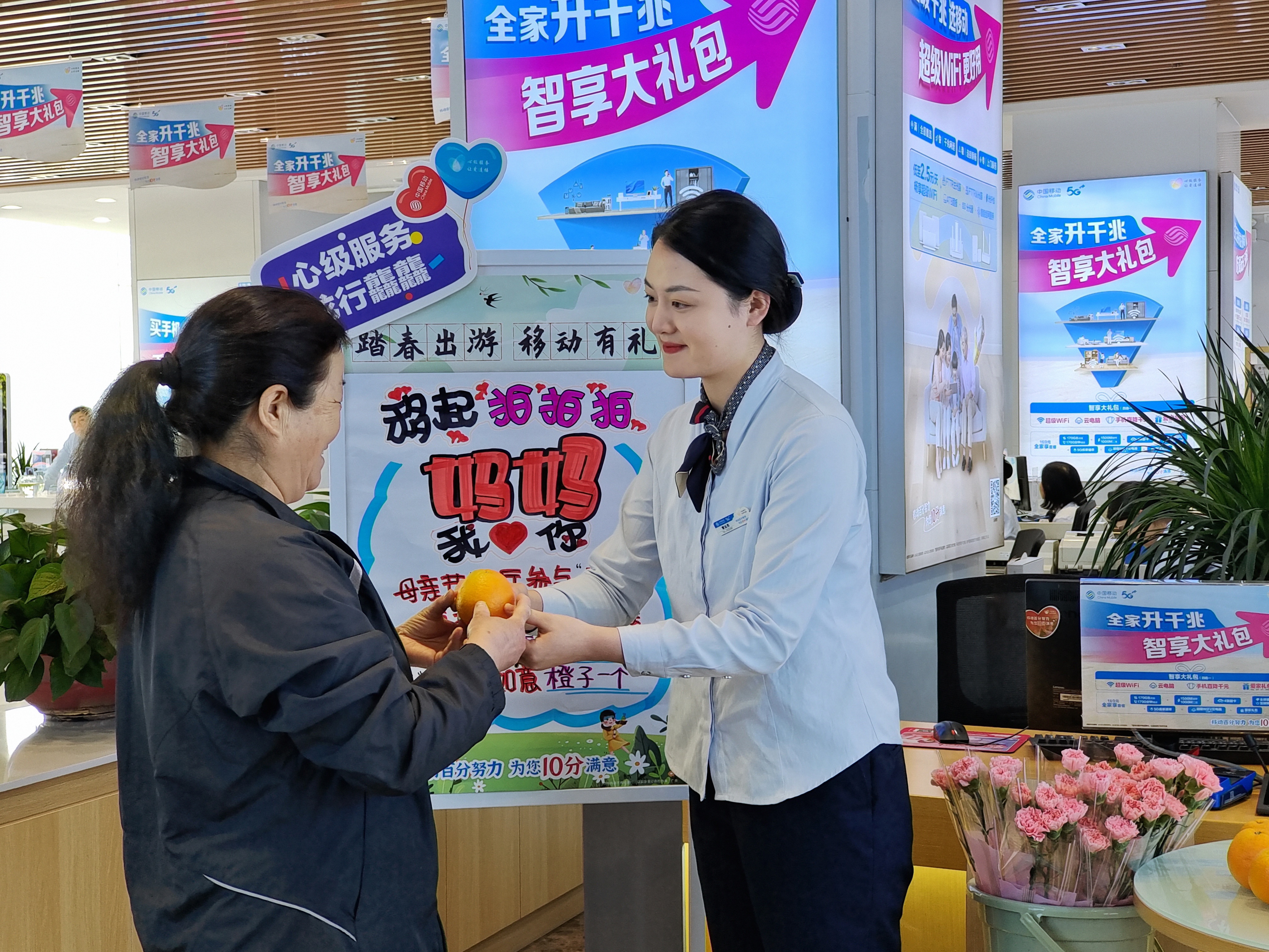 花,自古以来就是表达情感的美妙信物,橙子又拥有甜蜜的香气,康乃馨与橙子的组合,蕴含着“称心如意”的美好寓意,在5月12日母亲节这个特别的日子,保定移动为妈妈们送上鲜花和水果,为妈妈们送上美好祝福。“闺女,能帮我看看这个手机吗,这边话费好像没有了,我这边又不会查余额现在电话打不出,但是前阵子我老伴儿给交过了,帮忙看看吧!”“您别急阿姨,我给您现在就查查,别急!”保定天鹅西路旗舰店的营业员谷雨珊马上为阿姨查看话费余额情况,教会阿姨如何在中国移动app查询话费及线上交话费,还为阿姨送上了甜蜜的橙子和节日的祝福。“做好服务是我们的工作,希望妈妈们都能像这鲜花一般,生活的美丽、绽放,像这橙子一般甜蜜美好,“谷雨珊如是说。