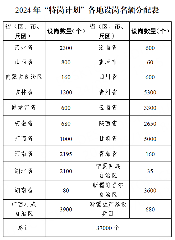 (二)招聘数量。2024年全国计划招聘“特岗计划”教师37000名,各省(区、市)和新疆生产建设兵团的招聘名额见2024年“特岗计划”各地设岗名额分配表(附件)。