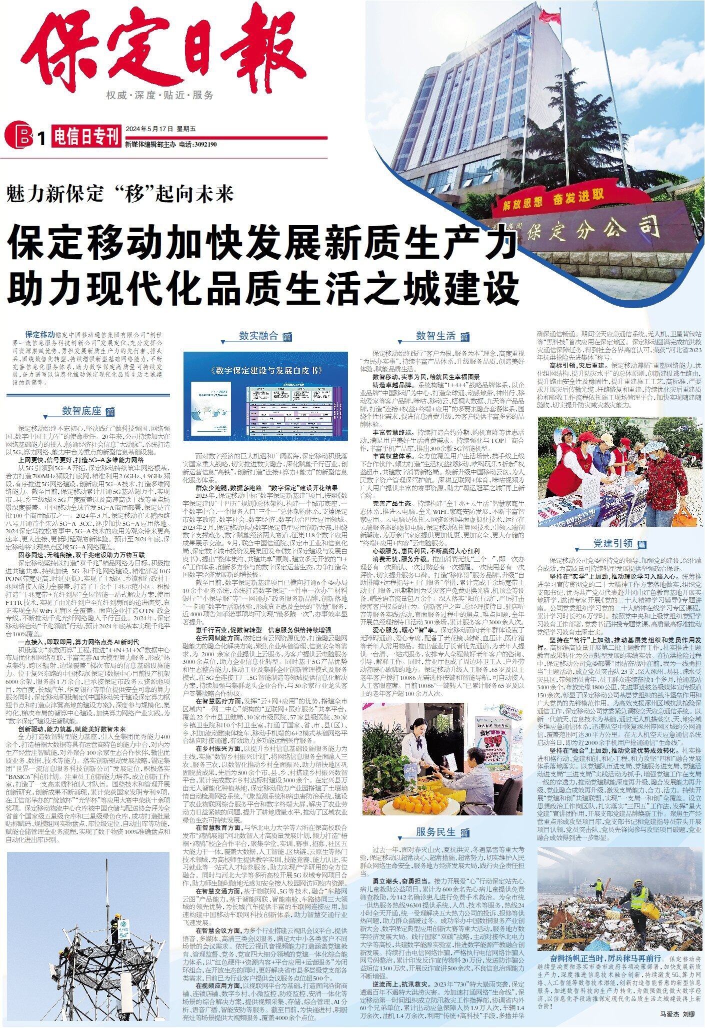 保定移动锚定中国移动通信集团有限公司“创世界一流信息服务科技创新公司”发展定位,充分发挥公司资源禀赋优势,勇担发展新质生产力的先行者、排头兵,围绕数智化转型,持续增强新型基础网络能力,不断完善信息化服务体系,助力数字保定高质量可持续发展,奋力谱写以信息化推动保定现代化品质生活之城建设的新篇章。
