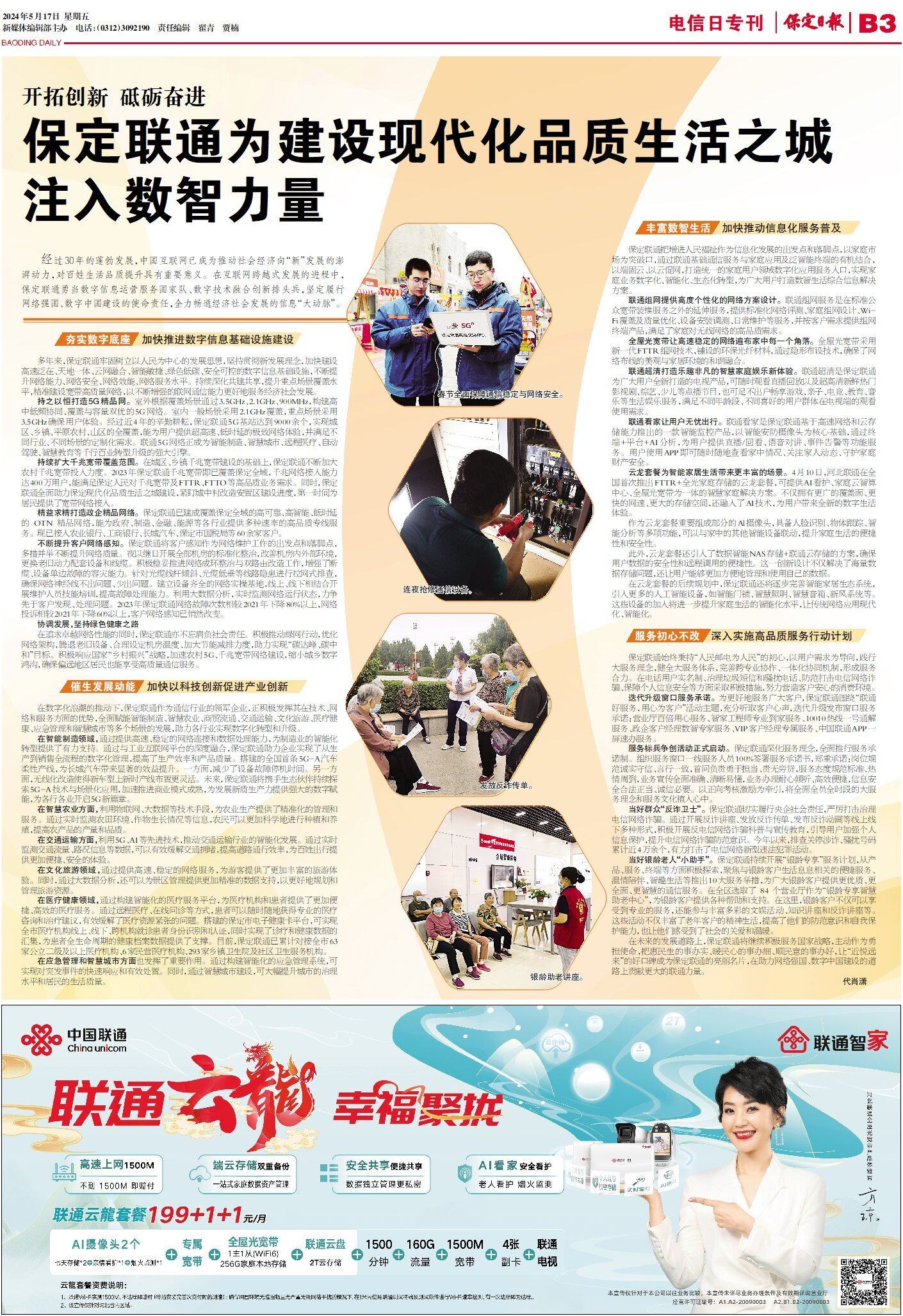 在未来的发展道路上,保定联通将继续积极服务国家战略,主动作为勇担使命,把惠民生的事办实、暖民心的事办细、顺民意的事办好,让“近悦远来”的好口碑成为保定联通的亮丽名片,在助力网络强国、数字中国建设的道路上贡献更大的联通力量。