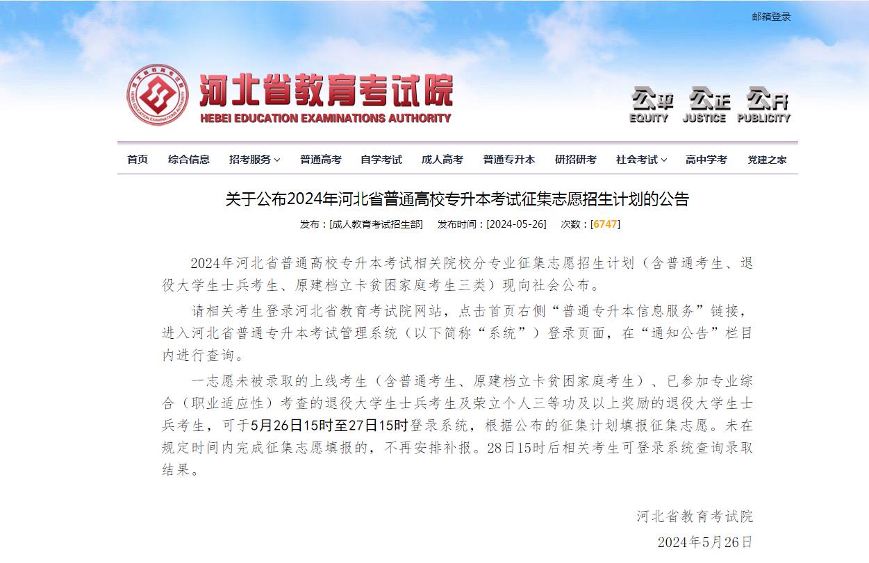 纵览客户端讯 据河北省教育考试院官网消息,5月26日河北省教育考试院发布关于公布2024年河北省普通高校专升本考试征集志愿招生计划的公告。公告指出,一志愿未被录取的上线考生(含普通考生、原建档立卡贫困家庭考生)、已参加专业综合(职业适应性)考查的退役大学生士兵考生及荣立个人三等功及以上奖励的退役大学生士兵考生,可于5月26日15时至27日15时登录系统,根据公布的征集计划填报征集志愿。具体公告如下: