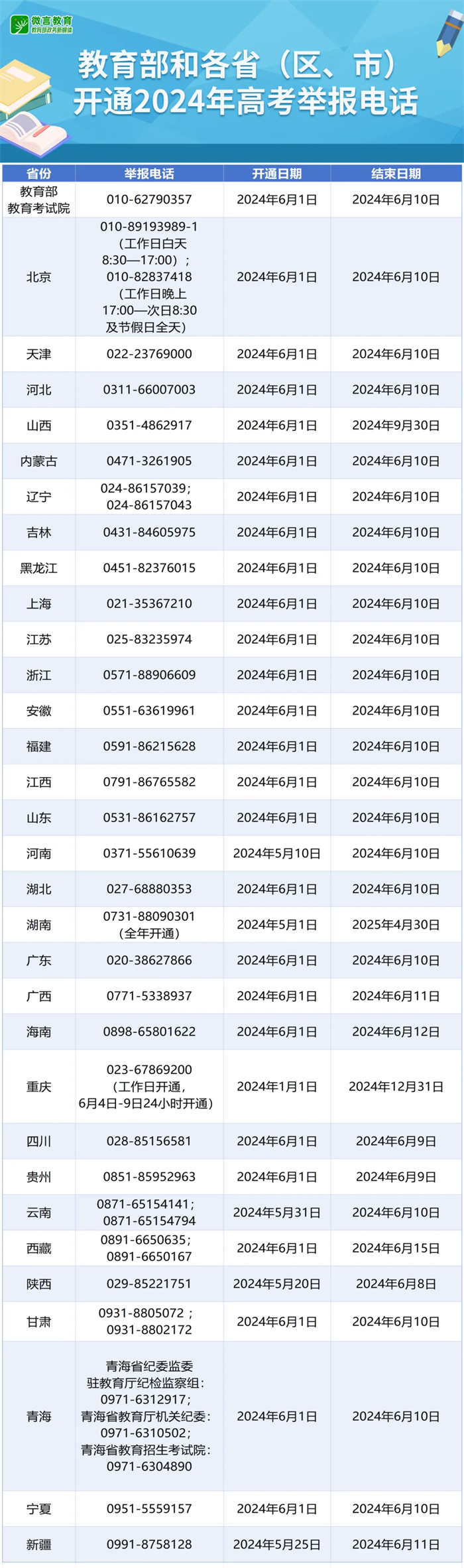 近日,教育部统一公布了教育部以及各省(区、市)2024年的高考举报电话,欢迎广大考生、家长及社会各界人士及时举报反映涉及2024年高考的问题线索。教育部及各省(区、市)将会同有关部门根据举报线索第一时间核查处理,坚决维护高考公平公正。