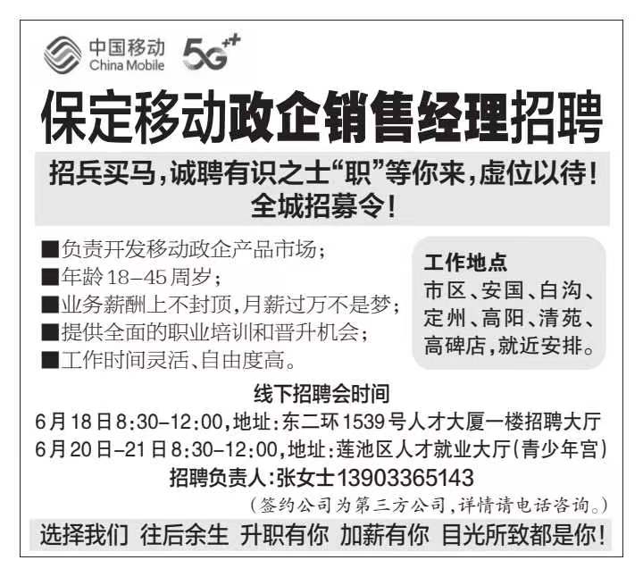 保定移动政企销售经理招聘
