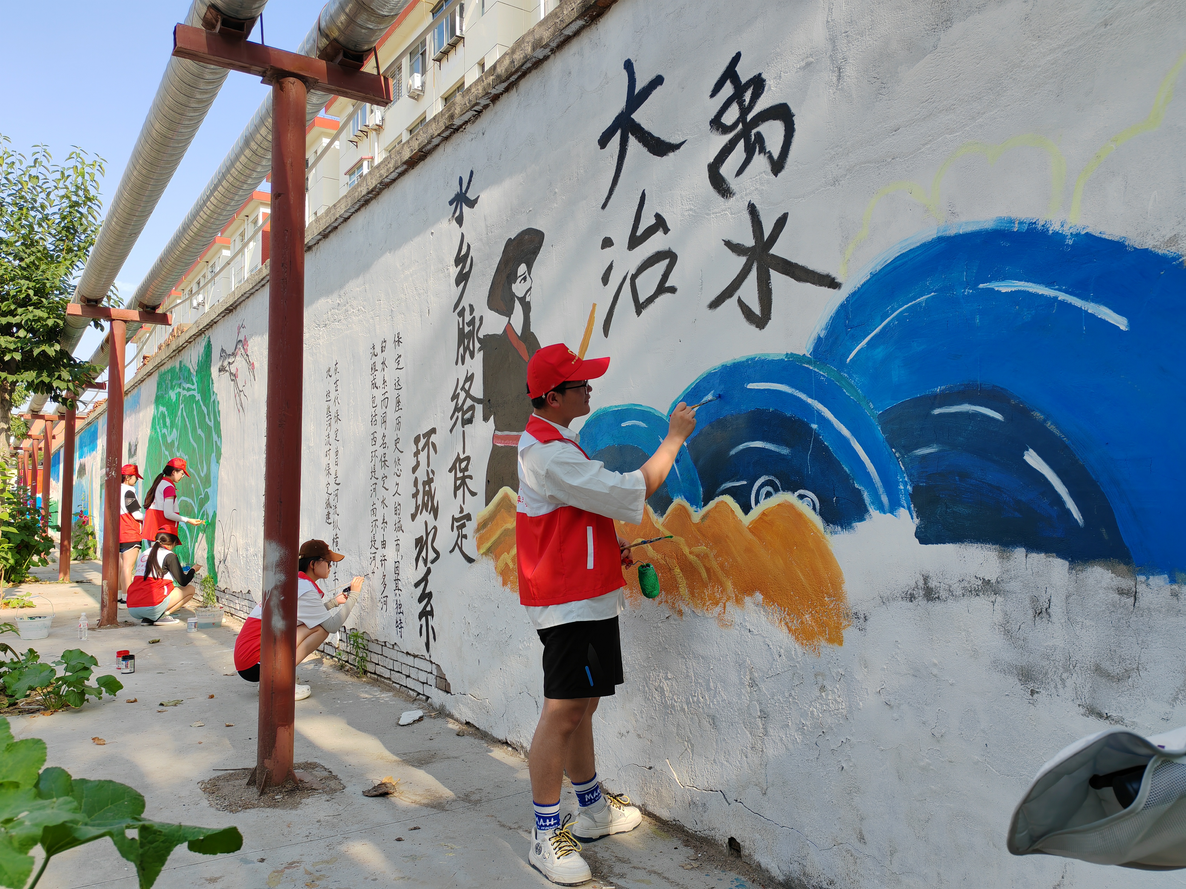 “这两面围墙总计长60多米、高约3米,结合小区为省水工一处宿舍这一特点,我们与大学生们充分沟通后确定了墙体彩绘主题。”钻石社区党委书记张欢说,在准备阶段,她特意带领大学生志愿者前往市水利博物馆参观学习,寻找灵感。管理小区的火泰物业将围墙刷白打底,并出资购买了颜料、画笔等绘画用品,共同为小区环境美化贡献力量。