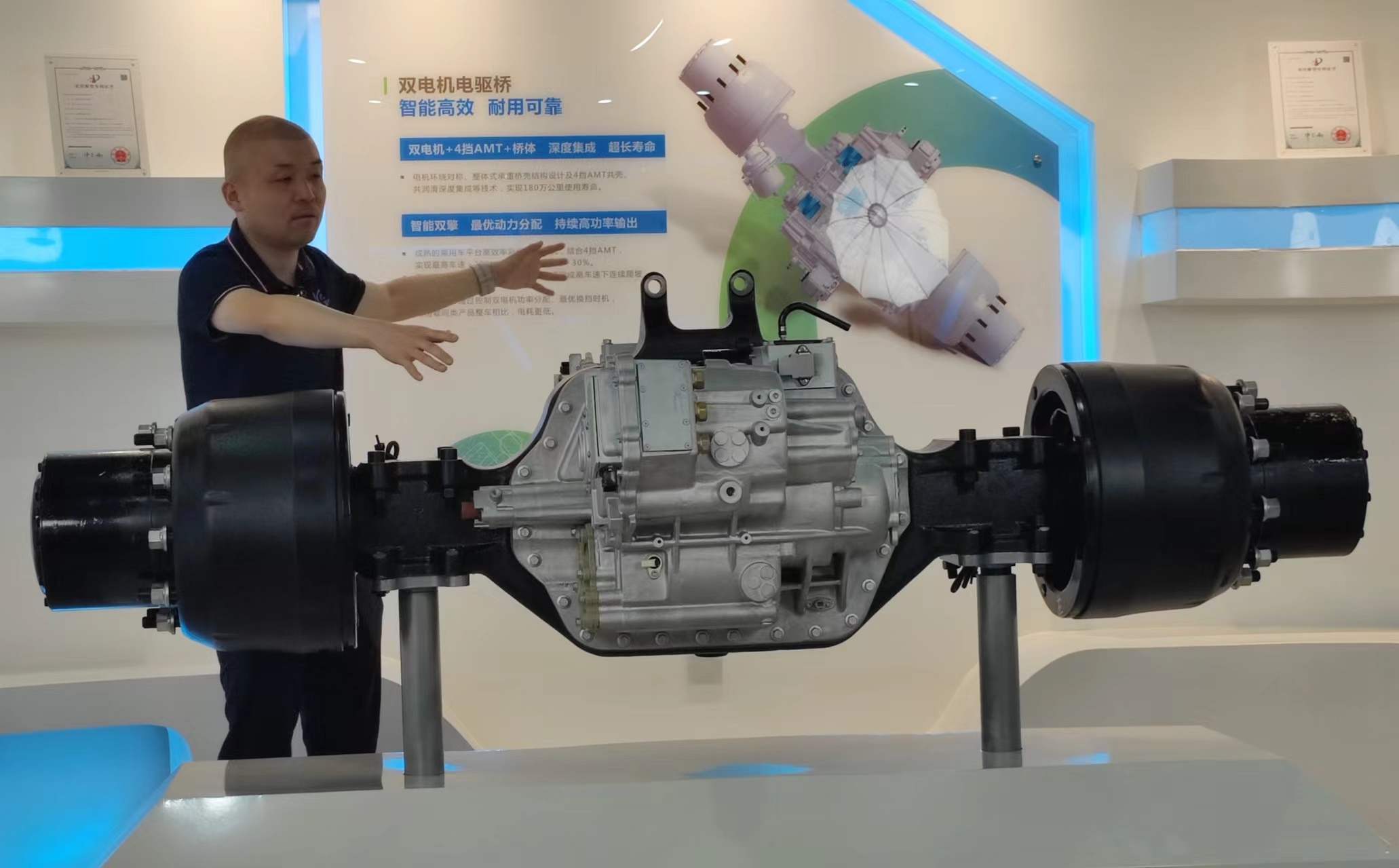 在发布现场记者获悉,相对于之前采用一个大电机的电驱桥,这种电驱桥采用双电机对称设计,在长时间和大震动路况下提升车桥整体结构的稳定性。