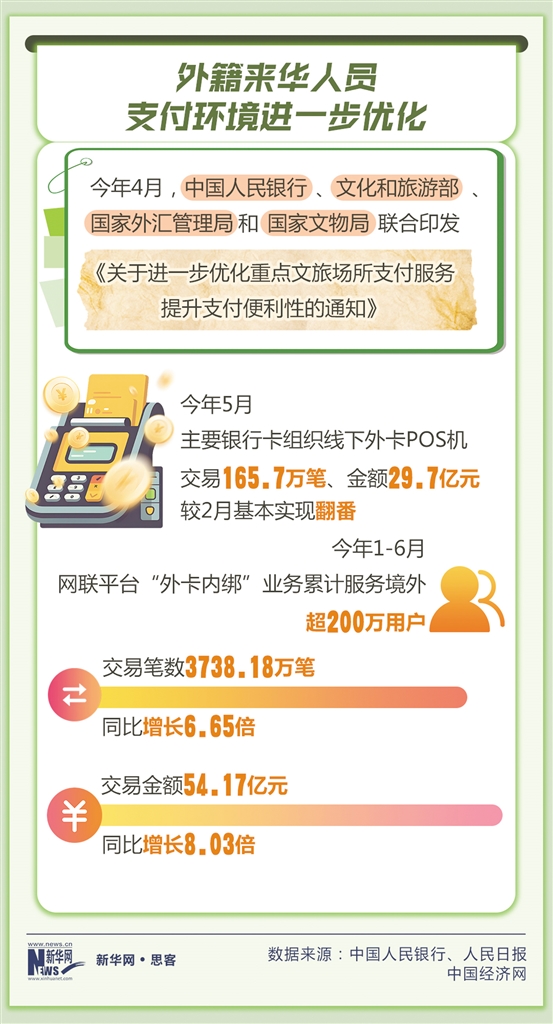 一方面,围绕入境游存在的“堵点”,多部门聚焦优化旅游服务体验,打造对外国人更友好的消费环境。今年4月,人民银行、文旅部等四部门联合印发通知,要求重点文旅场所实现境内外银行卡受理全覆盖,同时保障能够用现金支付兜底。最新数据显示,2024年5月,主要银行卡组织线下外卡POS机交易165.7万笔、金额29.7亿元,较2月基本实现翻番。同时,今年以来,网联清算公司联合商业银行、支付机构、卡组织等经营主体优化外籍来华人员移动支付服务,创新和推广“外包内用”“外卡内绑”业务,让外籍来华人员也能享受便捷安全的移动支付服务,感受中国数字经济的发展成果。数据显示,今年1-6月,网联平台“外卡内绑”业务累计服务境外超200万用户;交易笔数3738.18万笔,同比增长6.65倍;交易金额54.17亿元,同比增长8.03倍。