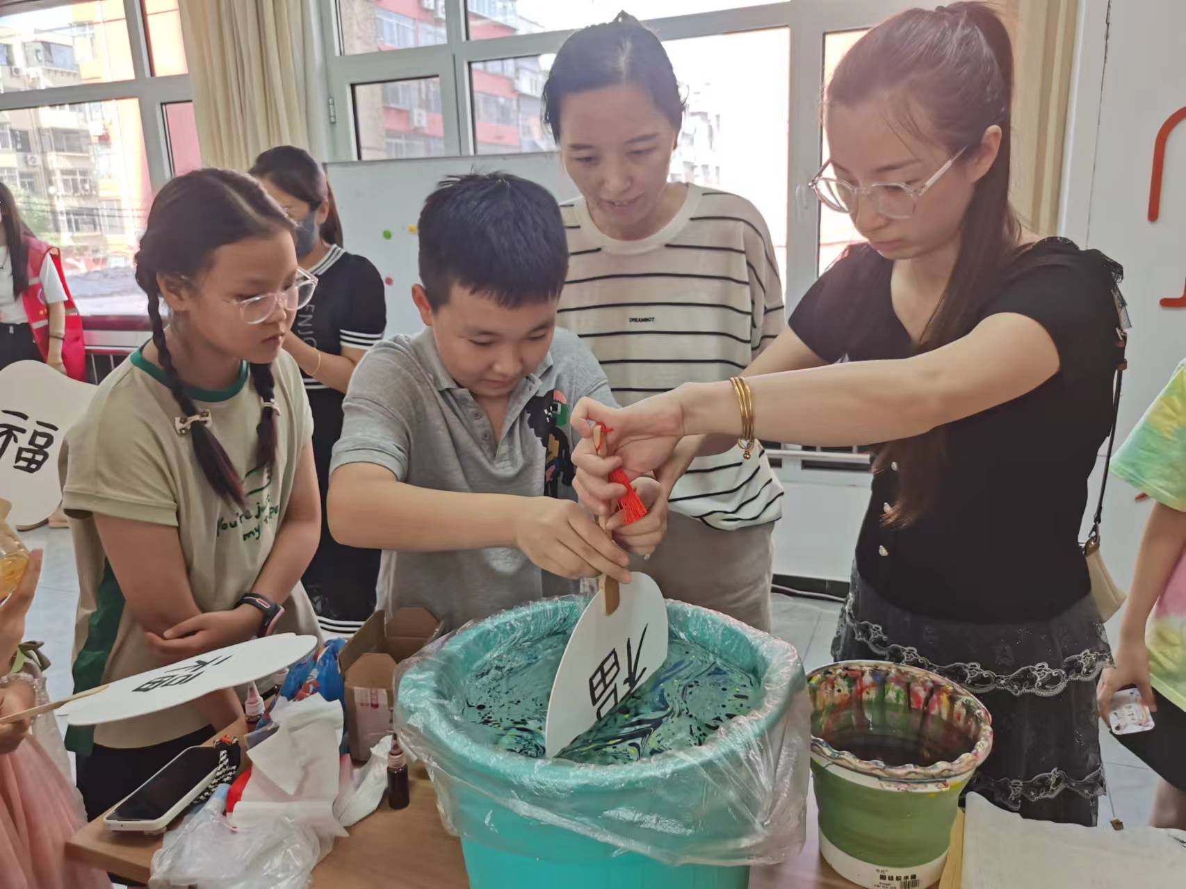 以漆为笔、以水作画,漆扇是中国传统手工艺品之一,具有悠久的历史和独特的工艺技巧。在体验非遗漆扇课上,志愿者老师带领孩子们深入了解漆扇的文化内涵和制作工艺,并指导大家亲手体验。孩子们发挥想象,将自己喜欢的颜色在水中渲染成独一无二的图纹,再将纸扇缓缓斜插入水中,轻移旋转间,一把把色彩绚烂的漆扇逐渐呈现在大家眼前。“孩子非常喜欢来社区参加暑假活动,在这里不仅能够学到很多课外知识,还能体验非遗文化,受益匪浅。”学生家长张女士说。
