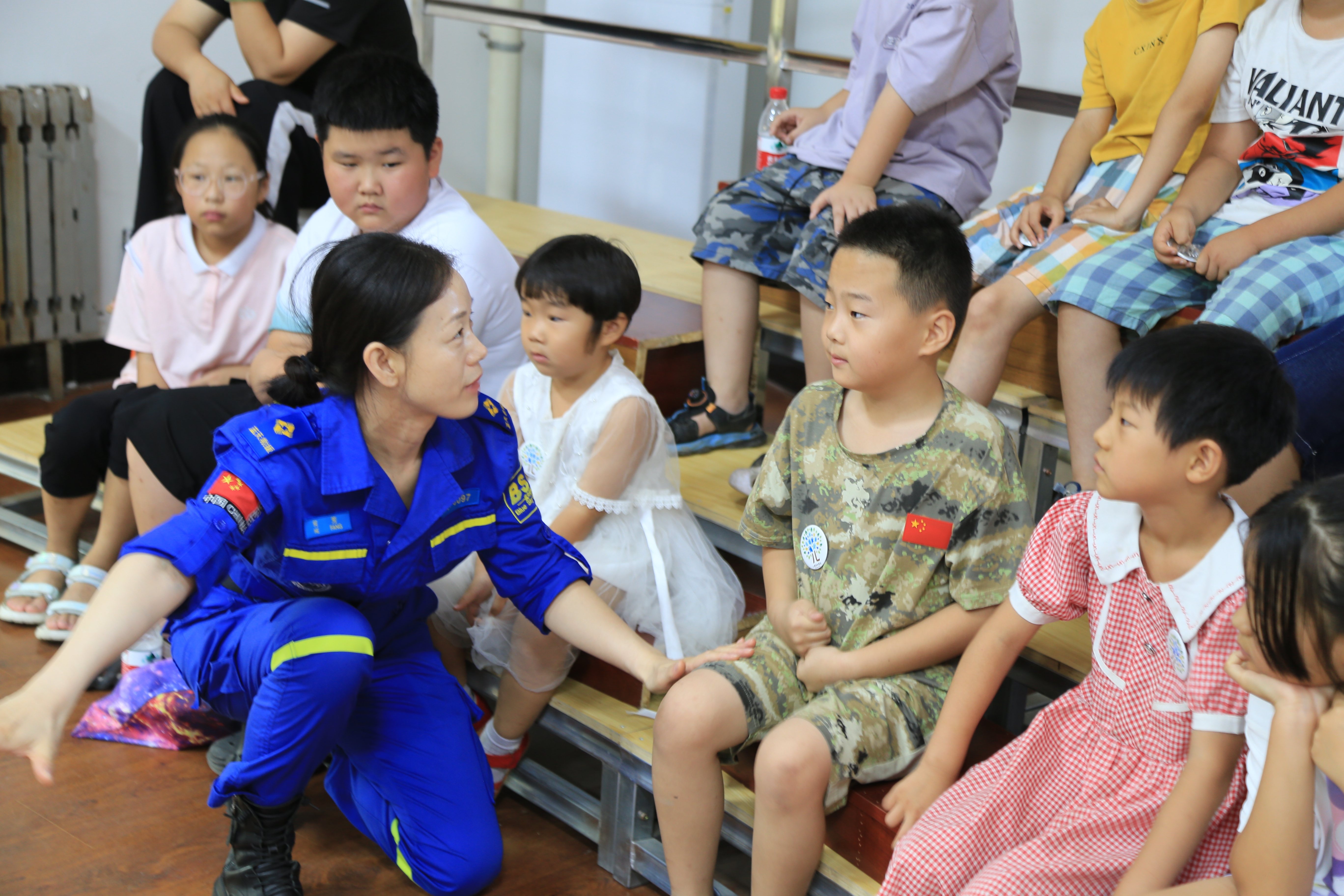蓝天救援队的队员们为孩子们上了一堂生动的防溺水安全知识课。他们结合实际救援经验,详细介绍了溺水的危险、预防溺水的措施以及遇到溺水情况时的正确应对方法,还通过模拟演示,让孩子们更加直观地了解如何正确使用救生设备和进行自救互救。同时,此次活动还邀请人武部和武警中队的教官们为孩子们展示整理内务的规范和技巧,重点讲解并示范了叠被子的方法,让孩子们知道良好生活习惯和自律精神的重要性。
