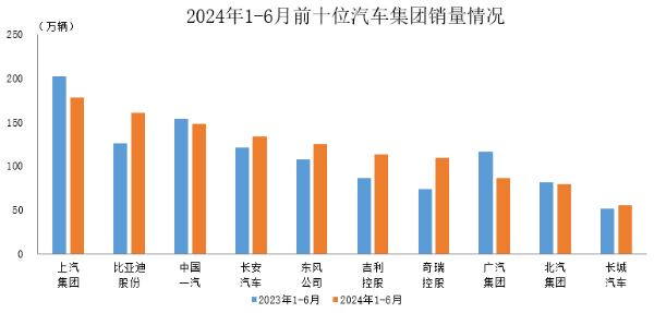 从企业市场层面数据来看,今年1-6月,汽车销量排名前十位的汽车集团中有6家实现了同比正增长。包括比亚迪、奇瑞、长安汽车、吉利汽车、东风汽车等在内的多家车企增速较为显著,交出了一份令人满意的成绩单。