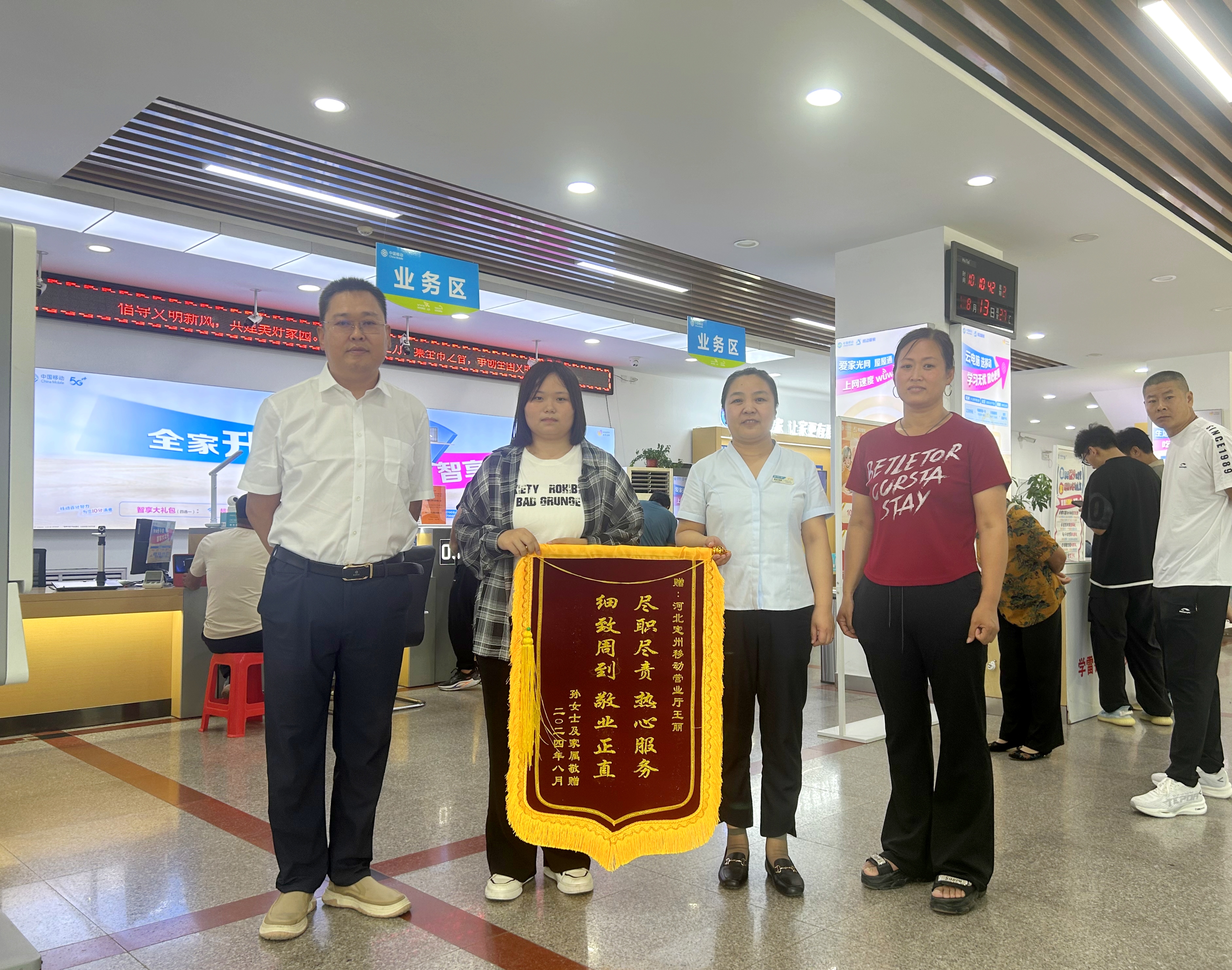 8月13日,河北定州的孙女士携孩子来到保定移动定州分公司中山路营业厅,将一面写有“尽职尽责热心服务 细致周到敬业正直”的锦旗递到了营业厅经理王丽的手中。孙女士称,通过营业厅热情的服务,孩子已顺利收到了燕京理工学院的录取通知书,此次前来赠送锦旗以表达感激之情。