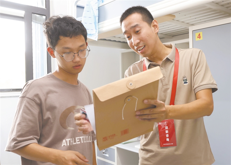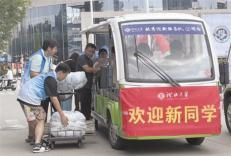 总咨询台设置在校门口,有老师和学生志愿者正在解答新生和家长的疑问,并负责将其指引到摆渡车停靠点。摆渡车每十分钟一趟,负责运送行李并接引学生和家长前往宿舍。虽然是新生报到第一天,记者却发现新生信息录入点并没有排长队。河北大学党委学生工作部思政科科长王博介绍,河北大学在微信公众号上推出新生线上预报到功能,学生可以提前填写好信息,预约报到时间。把迎新工作做在前面,这样学校就可以在后台预测人流量,合理安排报到工作,又能有效缓解周边交通压力。
