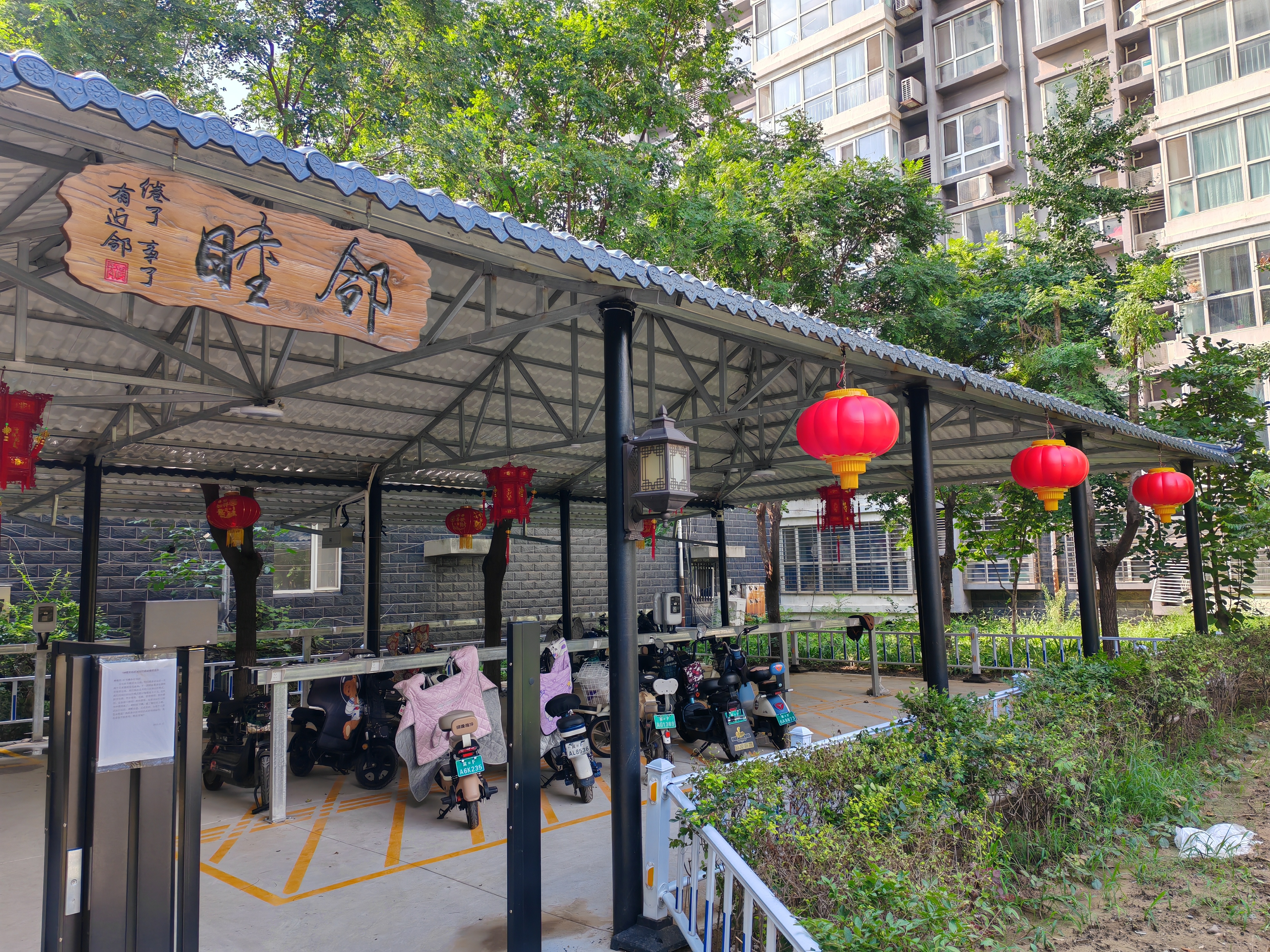 8月21日,记者来到小区16号楼附近看到,这座车棚采用灰色仿古顶棚,入口上方悬挂的“睦邻”两个大字格外引人注目,车棚内备有多个灭火器,一辆辆电动自行车整齐地停放在黄色标线内。
