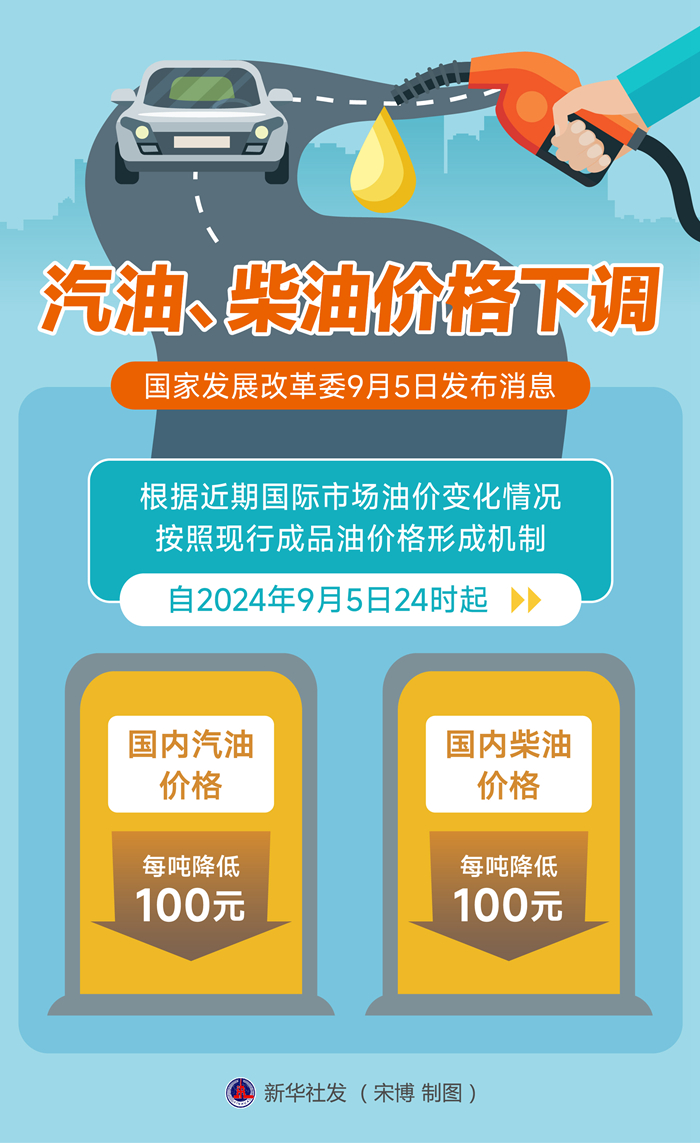 新华社北京9月5日电(记者陈炜伟)国家发展改革委5日发布消息,根据近期国际市场油价变化情况,按照现行成品油价格形成机制,自2024年9月5日24时起,国内汽、柴油价格每吨均降低100元。