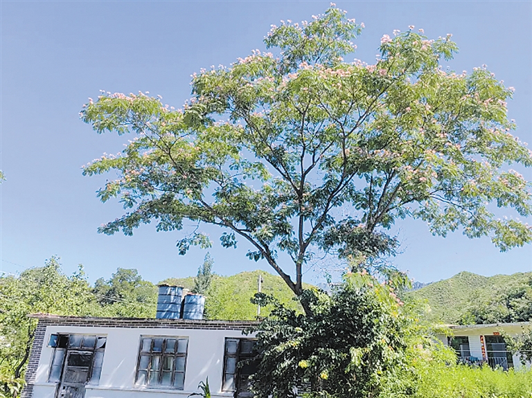 经过平房村龙堂沟门自然村的一处闲宅旁,绒花树还是像往年一样绽放着浅粉色的花朵。虽然没有隔壁那家的梧桐树那样粗犷伟岸,也没有路边白杨树那样笔直高大,它的花朵香气更没有漫山的槐花的芬芳馥郁,但是它那像含羞草一样的枝叶和像轻盈的羽毛一样的花朵足以惊艳所有观赏的人,远远望去就像一群栖落在枝头的白眉朱雀,是那么艳丽多彩,引人瞩目。