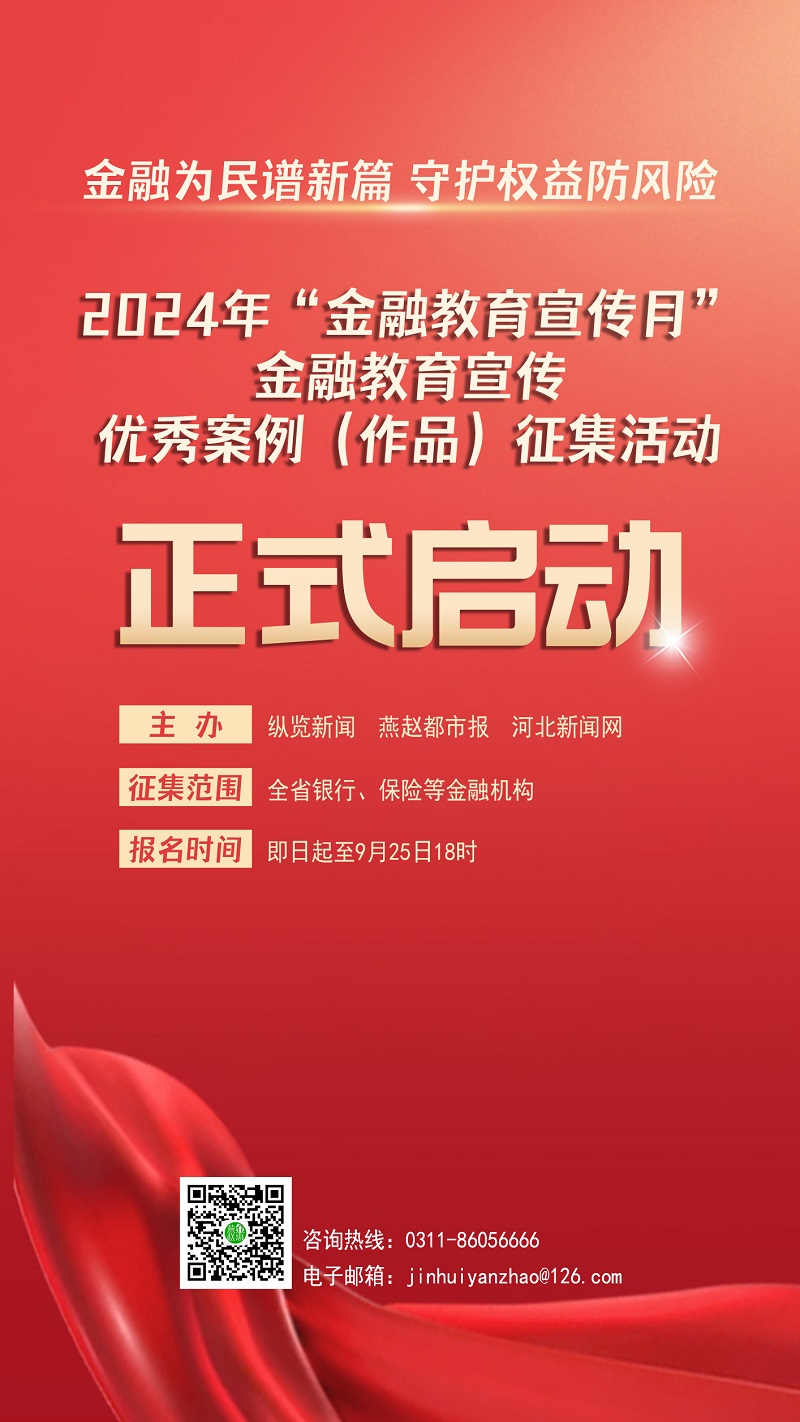 河北新闻网讯(记者 张静涛)由纵览新闻、燕赵都市报、河北新闻网主办的2024年“金融教育宣传月”金融教育宣传优秀案例(作品)征集活动即日起启动,9月25日18时前,河北广大金融机构可积极报名推送“金融教育宣传月”期间的优秀案例、优秀作品以及在“担当新使命 消保县域行”中的典型做法、先进经验。