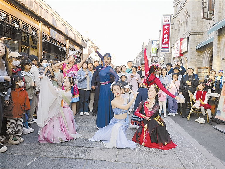 节日期间,人潮涌动的景象成为西大街的独特风景——这条老街焕然一新,古色古香的街道热闹非凡,氛围感十足。互动满满的非遗老店、口味丰富的特色小吃前人头攒动,深受游客喜爱;舞龙舞狮、锣鼓表演等民俗演绎让游客在街巷穿梭中感受着浓厚的文化氛围。同时,西大街推出新的演艺项目和打卡点,如“千人彩绘”“脸谱传情”“舞台炫彩,文艺献礼”文艺汇演、“我在保定”等,欢快的舞蹈让游客们情不自禁地加入其中,共享惬意时光。“保定是我和家人念念不忘的城市,这次是我们一家老小‘二刷’保定了,收获比之前更多。”10月1日下午,来自北京的游客张爽和家人在西大街开启假期第一站。她告诉记者,在这里不仅能感受繁华街区的浓浓烟火气,还能在一砖一石、一房一瓦中游览古建筑,触摸历史。据了解,国庆假期第一天,西大街接待客流达4万人次,同比增长了74.71%。