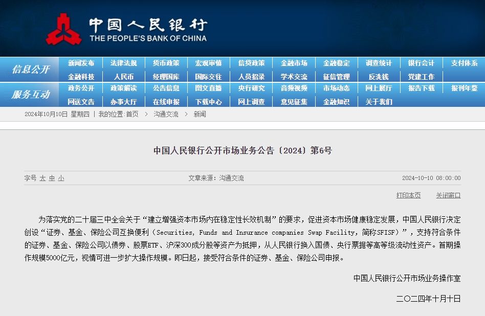 为落实党的二十届三中全会关于“建立增强资本市场内在稳定性长效机制”的要求,促进资本市场健康稳定发展,中国人民银行决定创设“证券、基金、保险公司互换便利(Securities, Funds and Insurance companies Swap Facility,简称SFISF)”,支持符合条件的证券、基金、保险公司以债券、股票ETF、沪深300成分股等资产为抵押,从人民银行换入国债、央行票据等高等级流动性资产。首期操作规模5000亿元,视情可进一步扩大操作规模。即日起,接受符合条件的证券、基金、保险公司申报。