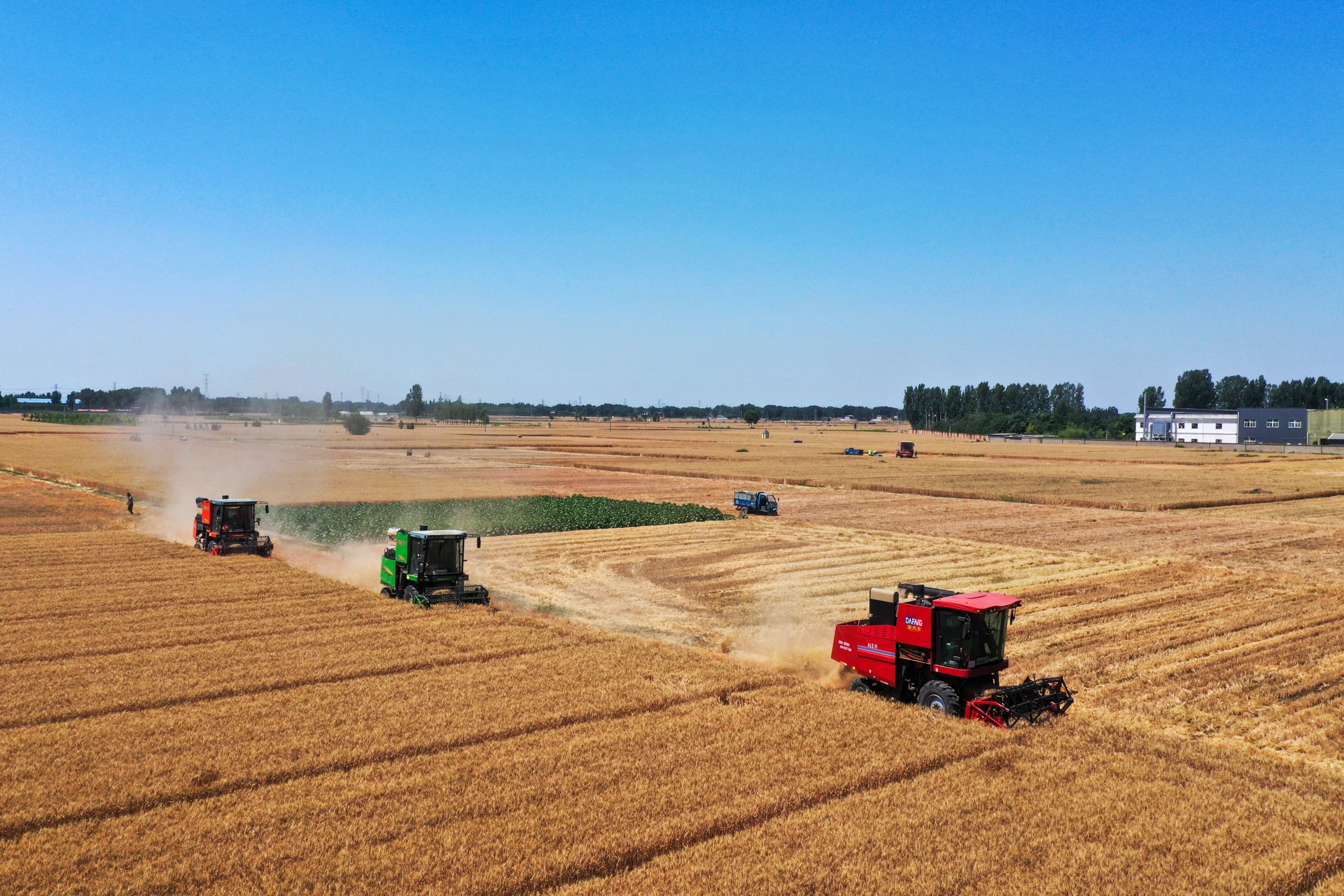 图为夏收时节,定兴县内章镇大北召村高标准农田里,大型农业机械正在进场收麦。 张曾良 摄