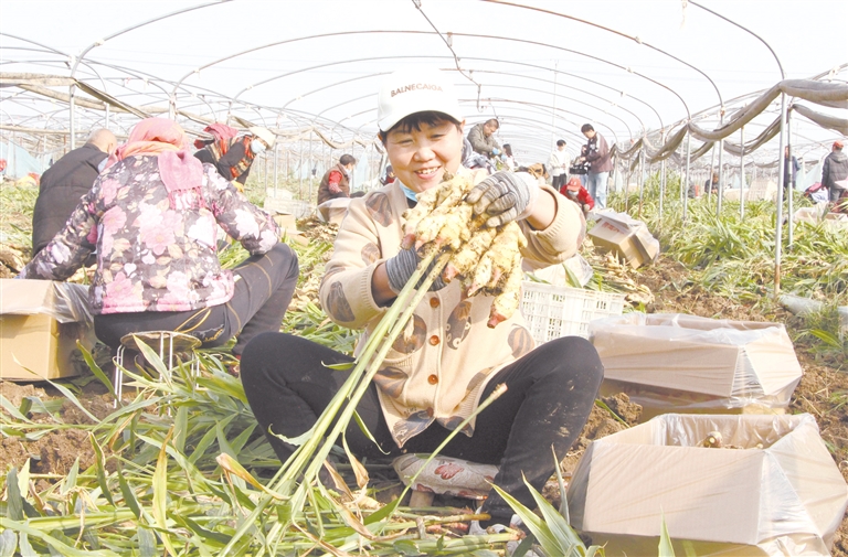 该合作社负责人薛建春介绍,这是他们种植生姜的第四个年头,已与山东多家大型农产品批发市场建立合作关系。今年该合作社种植生姜150亩,均为4月份冷棚种植,10月份收获,品种包括“大面姜”“小胖孩”和“山农一号”等优质品种,采用有机肥种植,使用生物药剂防治病虫害,真正实现了绿色无污染,期间聘请山东专业技术人员实地指导。今年生姜亩产达一万斤以上,比去年增产2000多斤。今年生姜的丰收不仅为合作社带来可观的经济效益,还为当地农民提供更多的就业机会和收入来源。他明年打算再扩种100亩。