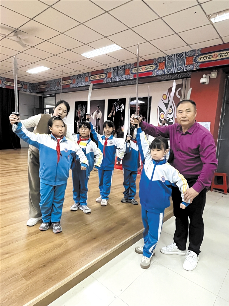 “举刀,刀刃向外,兰花拳,跑场,起——”11月5日下午4时30分,国家一级演员、国家非物质文化遗产保定老调省级代表性传承人杜振忠如常走进学校艺术课堂,给孩子们普及戏曲知识和基础动作。虽已年逾六旬,但他依然在现场忙前忙后,跑场、踢腿、下腰,指导孩子们基本功训练。他双目炯炯有神,浑身透着一股青春的气息,给孩子们做示范动作一点儿也不含糊,尤其手脚达到标准动作再配以犀利表情,表演者的形象立即惟妙惟肖起来。当日下午协助他辅导的还有我市京剧梅派青年演员李静,在孩子们的基本动作方面给予指导。“戏曲是一本读不完的丛书,戏曲进校园活动的开展,给孩子们从小就种下文化的种子。”杜振忠对记者说,孩子们通过学习戏曲知识,可以了解地方礼节、人文历史等情况,读懂我们中国的传统文化。