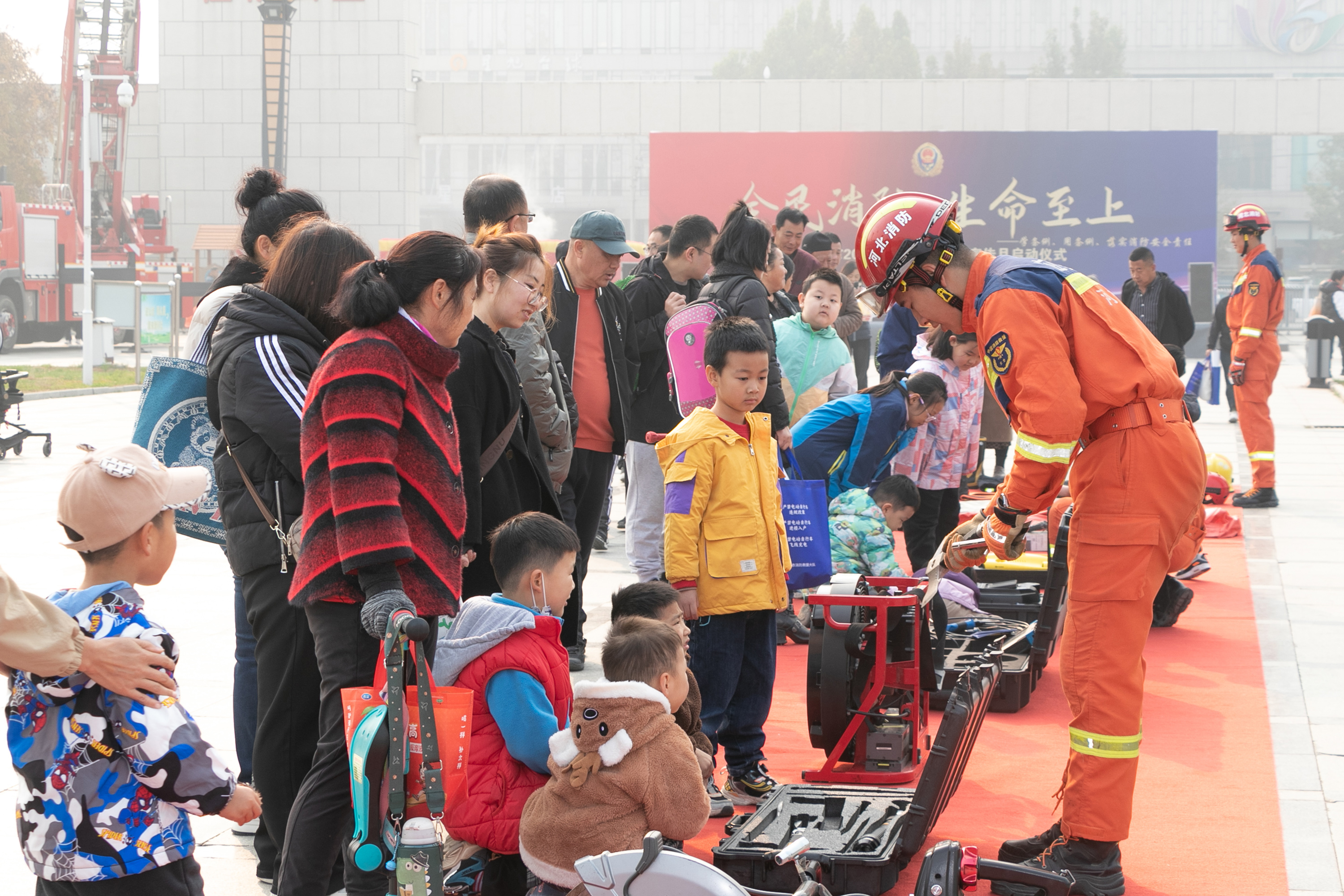 宣传人员为群众讲解消防法律法规,发放电动自行车安全充电等宣传彩页,提醒大家在日常生活中要注意用火、用电、用气安全。消防人员向群众介绍专业消防设备的功能和使用方法,并演示油锅灭火、无齿锯破拆防盗门等操作科目。为吸引更多的人关注消防、参与消防,现场还展示了部分学生的作文和绘画作品。