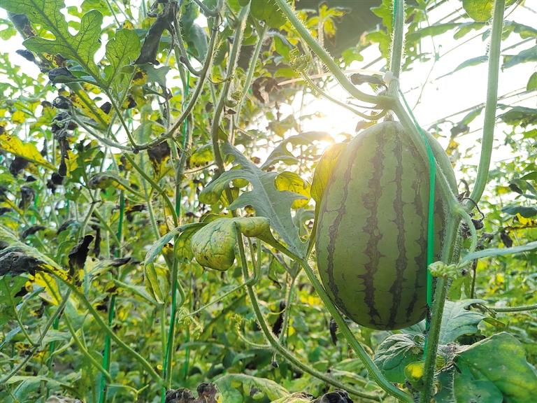 据了解,吊秧技术栽培出来的西瓜着色均匀,没有阴阳面,糖度分布均匀、瓜皮薄、肉质香甜脆嫩、汁水充足,很受市场欢迎。