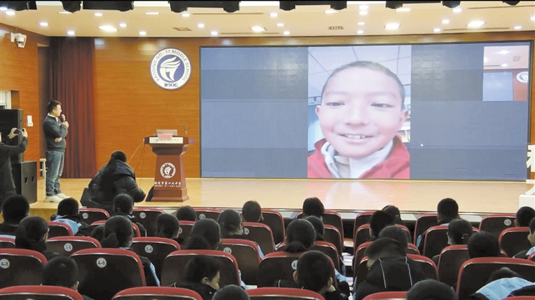 在保定市第十七中学(保定外国语学校校区)报告厅,除现场听报告的学生外,此次讲座还设置了一个特殊环节——与西藏拉萨阿里河北完全中学初一2班44名学生连线互动,共上一堂科学课。云端好课共享,一块屏幕,拉近了阿里和保定两地学生的距离,在两地孩子们心里播下科学的种子,点燃科学的梦想。