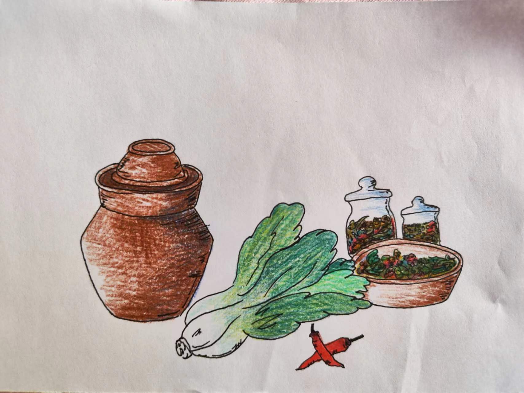 我家院外是一片菜地,母亲每年都会种些白菜萝卜等家常菜。节气一到,她便把菜收回来码放在阴凉处。碰到哪天天气好,她便挑些嫩菜一一清理干净,放在笸箩里,晒在太阳下,准备做腌菜。这时家里的“老古董”——瓦罐就派上用场了。