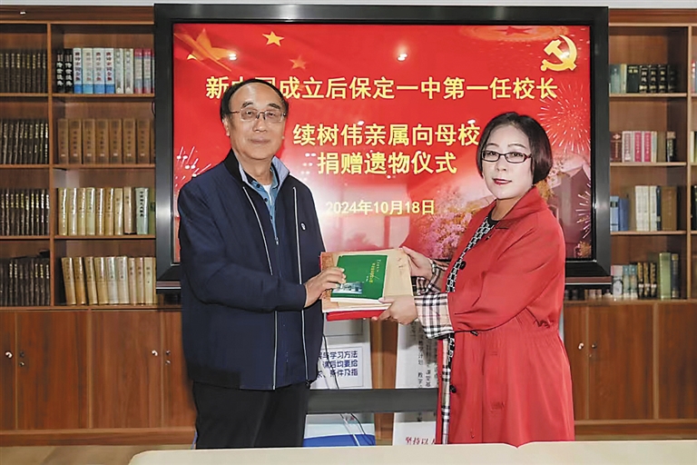 在图书馆二楼接待室北侧电子屏幕上,“新中国成立后保定一中第一任校长续树伟亲属向母校捐赠遗物仪式”三行大字非常醒目,保定市教育局、保定一中有关领导和学校相关老师与续树伟的亲属一起参加了捐赠仪式。