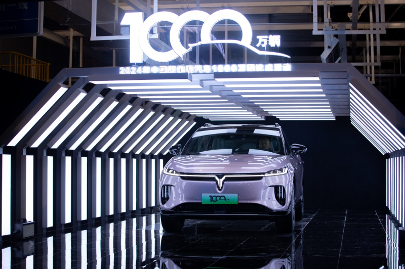 图为2024年11月14日,随着一辆崭新的岚图知音在武汉岚图云峰工厂驶出生产线,我国新能源汽车产量首次突破年度1000万辆,中国由汽车大国向汽车强国迈进走出坚实一步。