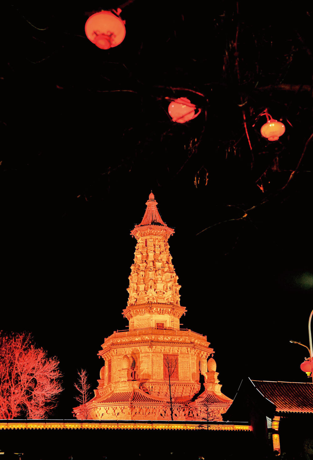 夜幕下,迎春灯火映照正定华塔,光彩愈加迷人,灰瓦红墙外,拍照游人笑靥如花。一墙之隔,赵生明烈士纪念碑上,“慰汝忠魂”碑文熠熠生辉。
