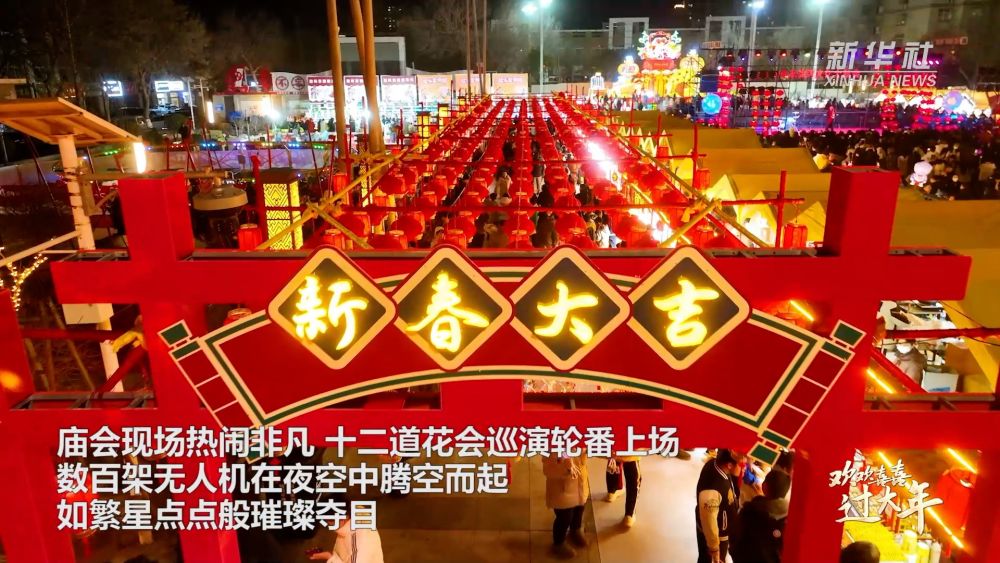 春节来临之际,在河北省廊坊市固安县新中街,人声鼎沸,万人空巷,2025年永定河文化大庙会隆重开街。庙会现场热闹非凡,十二道花会巡演轮番上场,数百架无人机在夜空中腾空而起,如繁星点点般璀璨夺目。