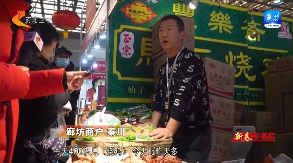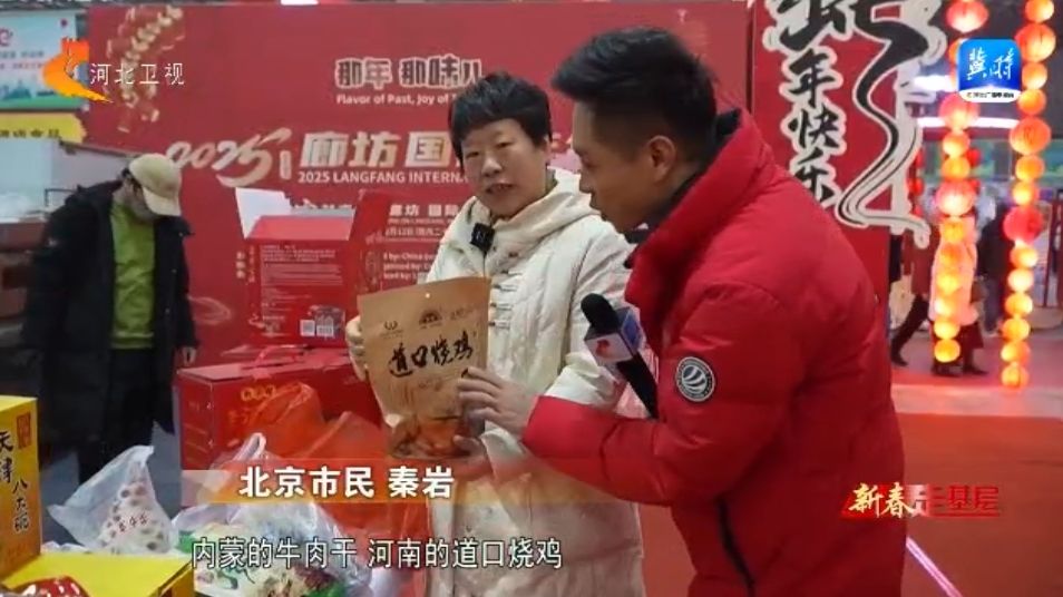 内蒙的牛肉干,河南的道口烧鸡,准备买个狗不理的老汤酱货。(记者:一站式都购齐了?)对。(记者:咱是哪儿的呀?)北京的。(记者:那怎么到这边来了?)异地养老,(记者:在咱廊坊养老?)对。(记者:今年过年就在这儿过了?)对,心情非常爽。