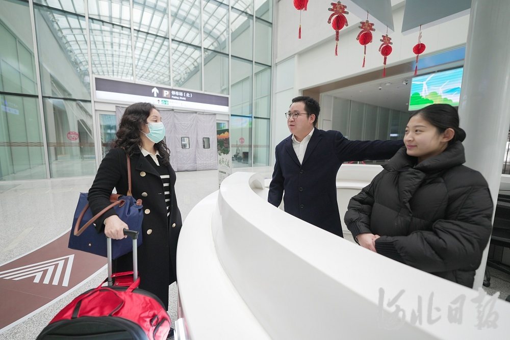 1月28日,在雄安站候车大厅内,杨春(右二)正在服务出站旅客。河北日报记者李畅摄