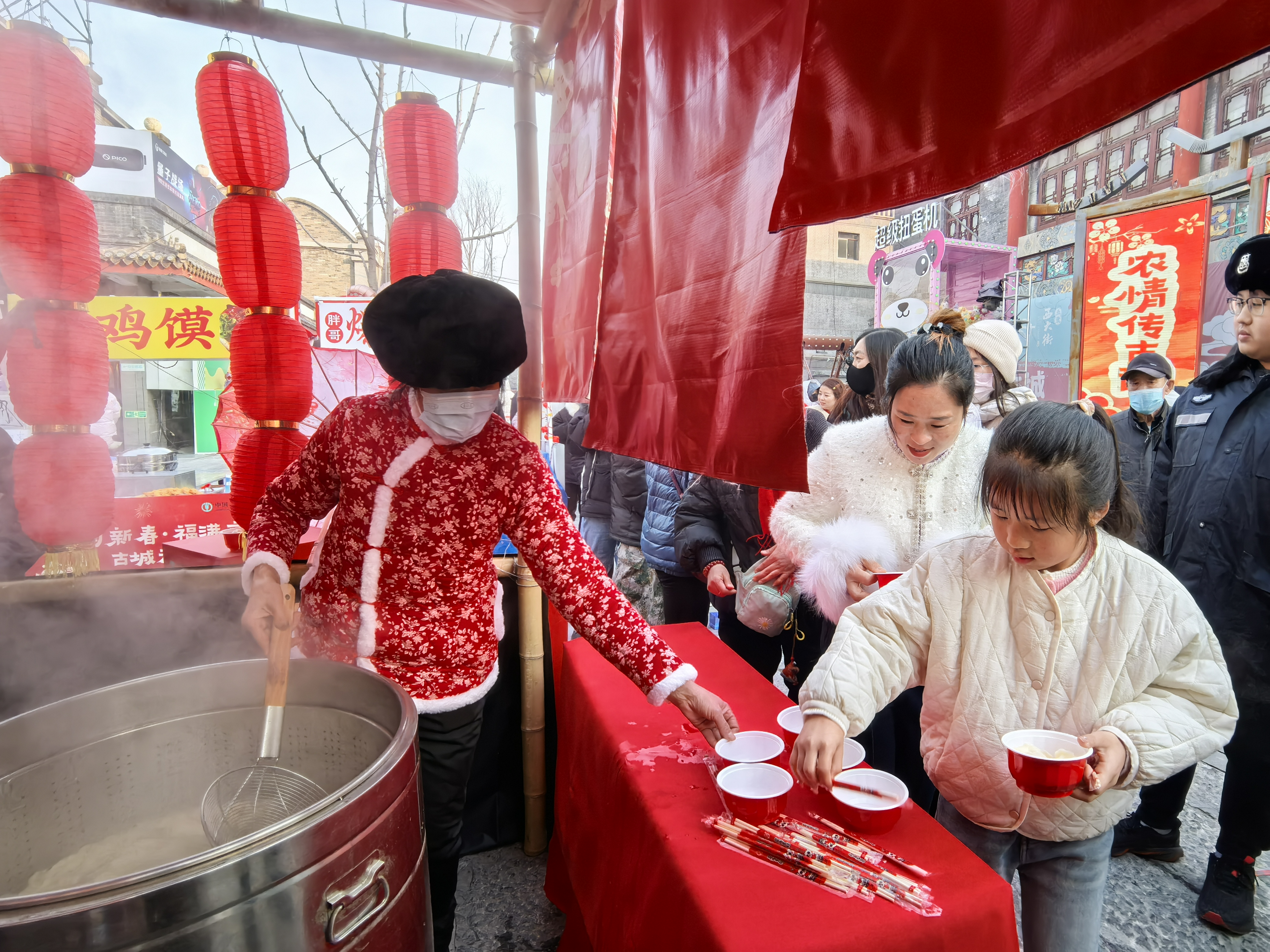 “金饺送福”活动现场,随着锅盖一掀,饺子出锅,工作人员手起勺落,一碗热气腾腾的饺子就被递到游客和执勤民警手中。一时间,街区里弥漫着诱人香气,传递着浓浓的新春暖意。游客李喜宝儿端着饺子,赞不绝口:“饺子是韭菜鸡蛋馅儿的,味道真不错。这里年味儿十足,氛围也特别好!”