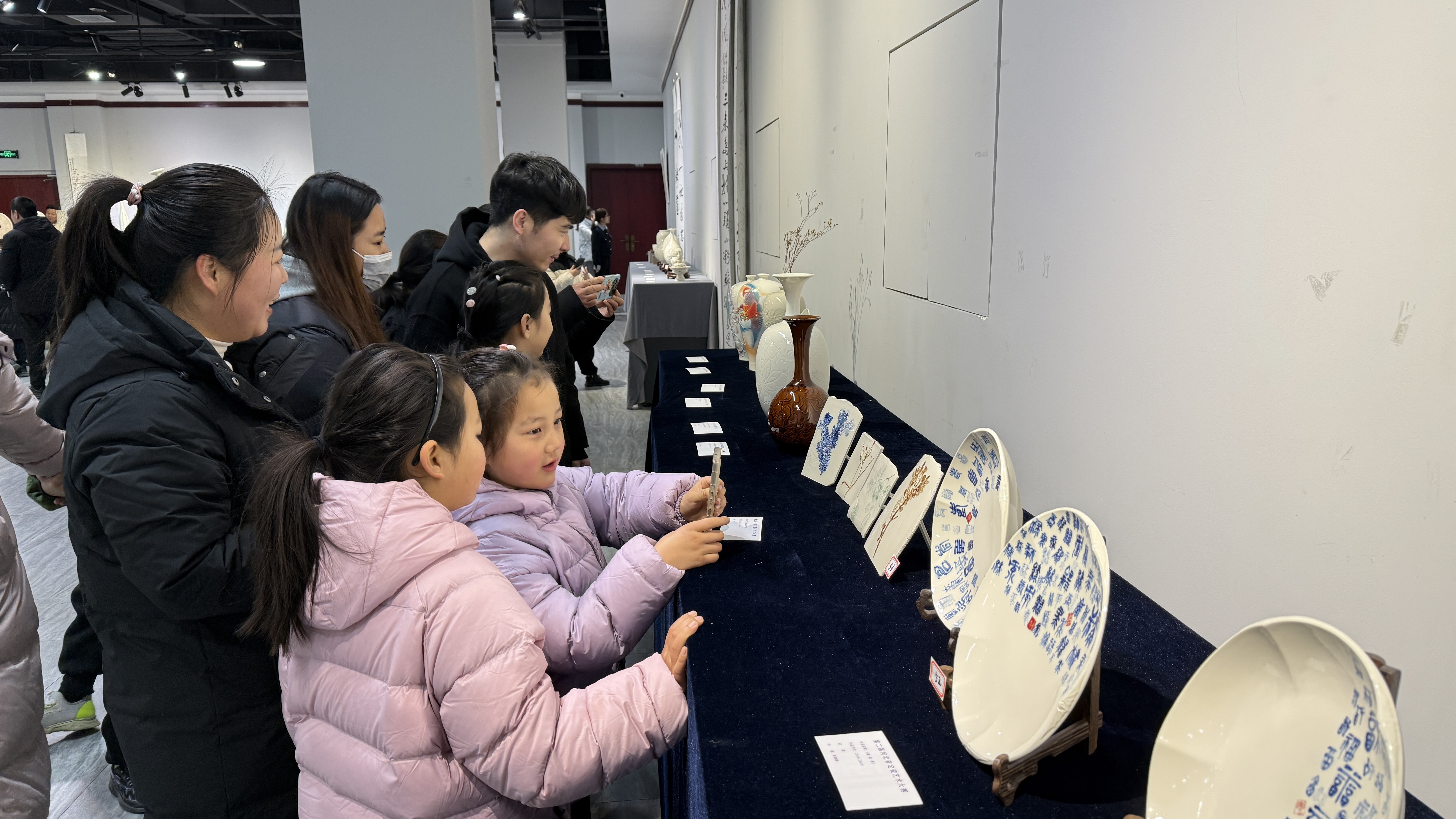 在陈文增定瓷艺术馆,师生一起参观了第二届河北省定瓷艺术展。一件件定瓷作品整齐排列、造型各异,精美的雕花、刻花工艺让人惊叹不已。跟随现场解说的工作人员,师生们还了解了每一件作品背后的故事。