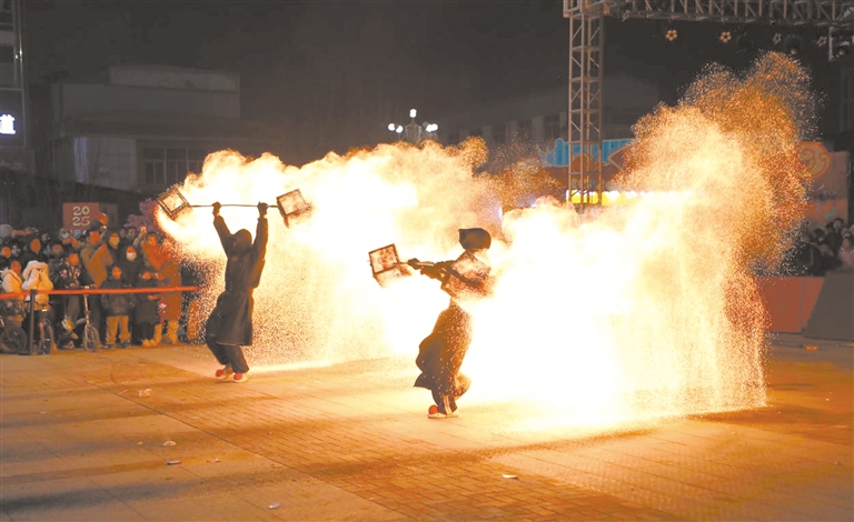 晚7时,“多彩融媒·国风文化展演”在非遗火壶表演中震撼开场,表演者熟练操控火壶,火焰在空中肆意舞动,瞬间点燃现场气氛。随后,歌曲、武术、二人转、变脸等精彩节目轮番上演,赢得台下观众阵阵掌声与欢呼声。“我平时就很喜欢国风文化,今天的活动不仅有精彩演出、传统美食,还加入了直播和互动环节,让我感受到浓厚的文化氛围和浓浓的年味儿。”涞水县居民李倩说。