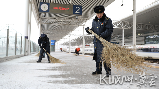 就在采访接近尾声时,天空中飘起了小雪。王辉担心站台地滑会影响旅客安全,立刻和同事们一起投入到清扫站台的工作中。他们忙碌的身影在雪花中显得格外坚定。