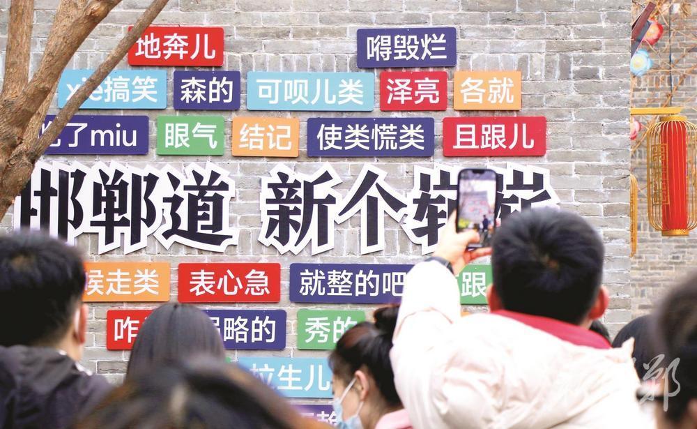 邯郸方言语汇网红打卡墙前,游客争相拍照留念。