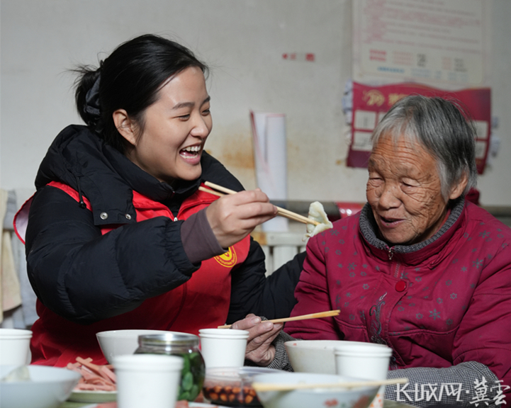 邢家湾镇学雷锋志愿服务队志愿者春节期间,陪独居老人孟庆格吃饭。长城网·冀云客户端记者 刘俐验 摄