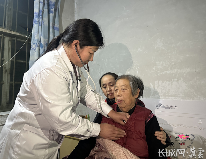 邢家湾镇学雷锋志愿服务队志愿者张素娟(中)带着村医上门为滏东村杨小格老人看病。长城网·冀云客户端记者 刘杨 摄