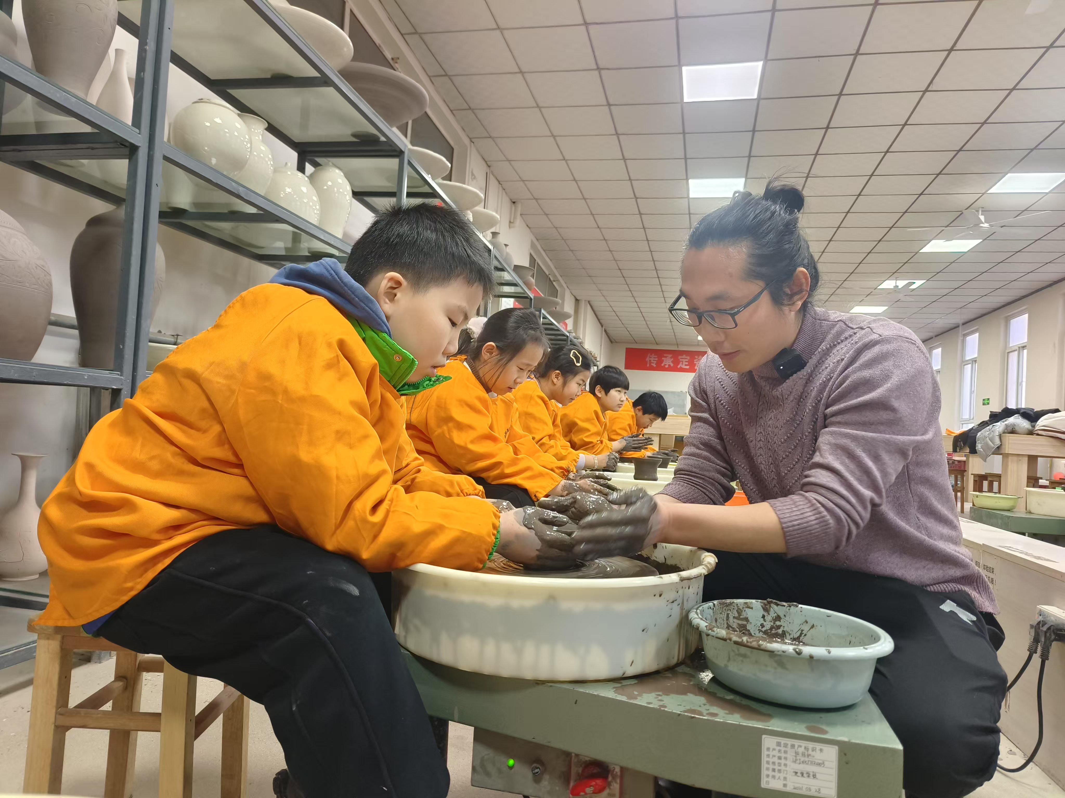 曲阳县定瓷培训学校工作人员刘永昌(右),正在指导前来研学的学生学习定瓷拉坯技艺。 唐笛 摄