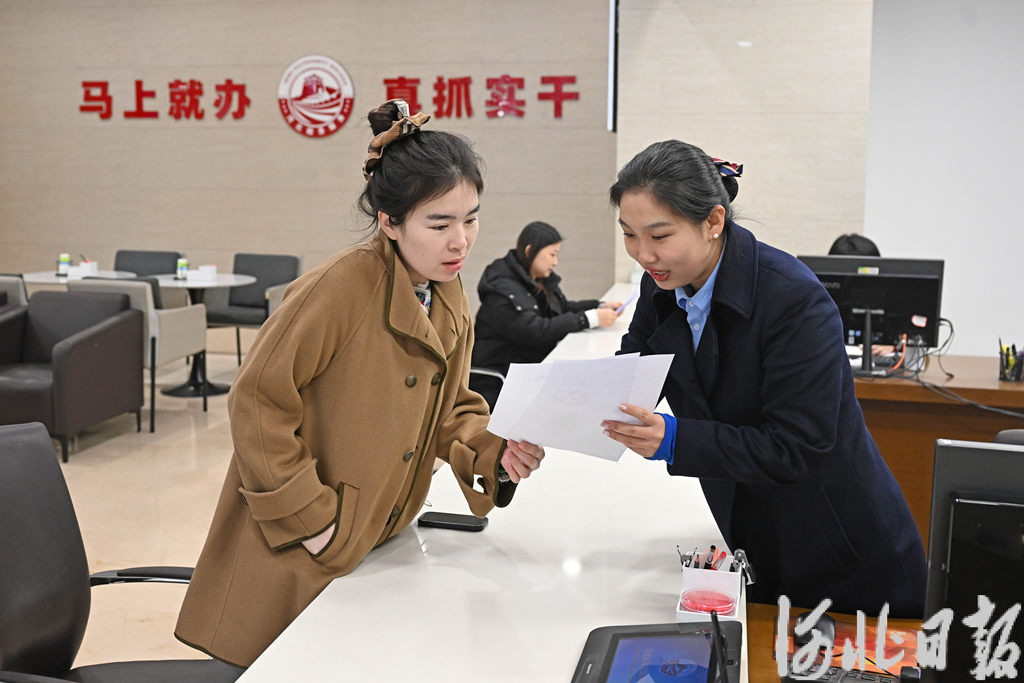 2月5日,企业办事人员王滢(左)在河北省政务服务大厅办理业务。河北日报记者张昊摄