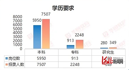 根据梳理,2025年河北省考中要求本科及以上的岗位5950个,招录7507人;要求专科及以上的岗位913个,招录2248人;要求研究生及以上的岗位280个,招录349人。要求专科及以上的岗位较2024年545个增加近七成。2025年河北省考应届毕业生还是主力军,岗位2943个,招录4274人,占比42.3%。