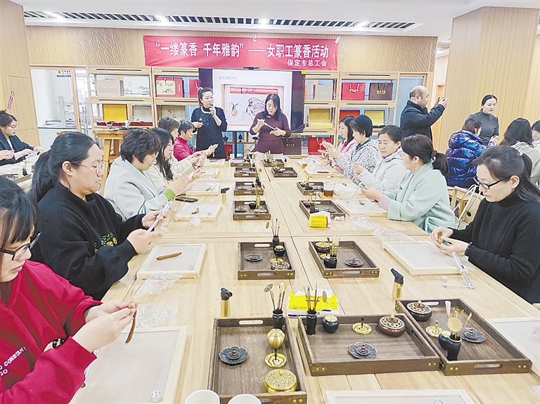 保定晚报讯(记者刘佳 通讯员何梓瑄)3月3日,市总工会在清苑区新经济产业园举行“一缕篆香 千年雅韵”主题活动,40名女职工齐聚一堂共迎“三八”国际妇女节。