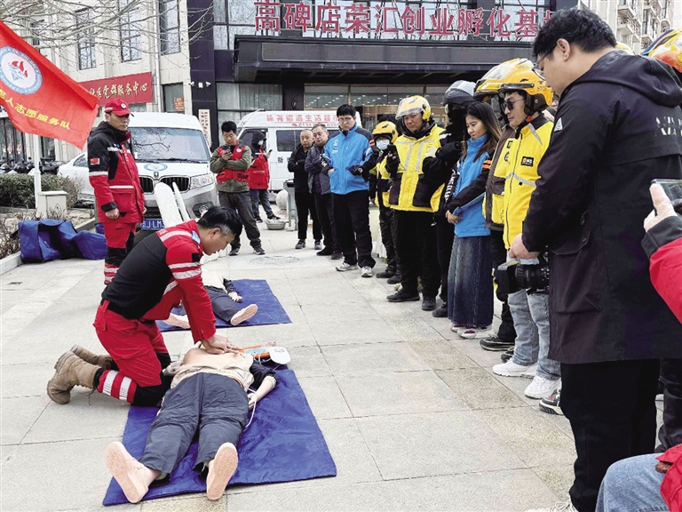 活动现场,义务开展“理论+实操”相结合的安全知识宣讲,内容涵盖交通安全法规、极端天气防护等。高碑店市新时代应急救援退役军人志愿服务队的队员们借助模拟人,详细介绍心肺复苏等常见急救技能的操作要点,并邀请外卖骑手亲身实践,确保他们掌握关键急救技巧,提升应对突发状况的能力。志愿者们精心准备的爱心午餐,也让参加活动的人员“暖胃”更“暖心”。