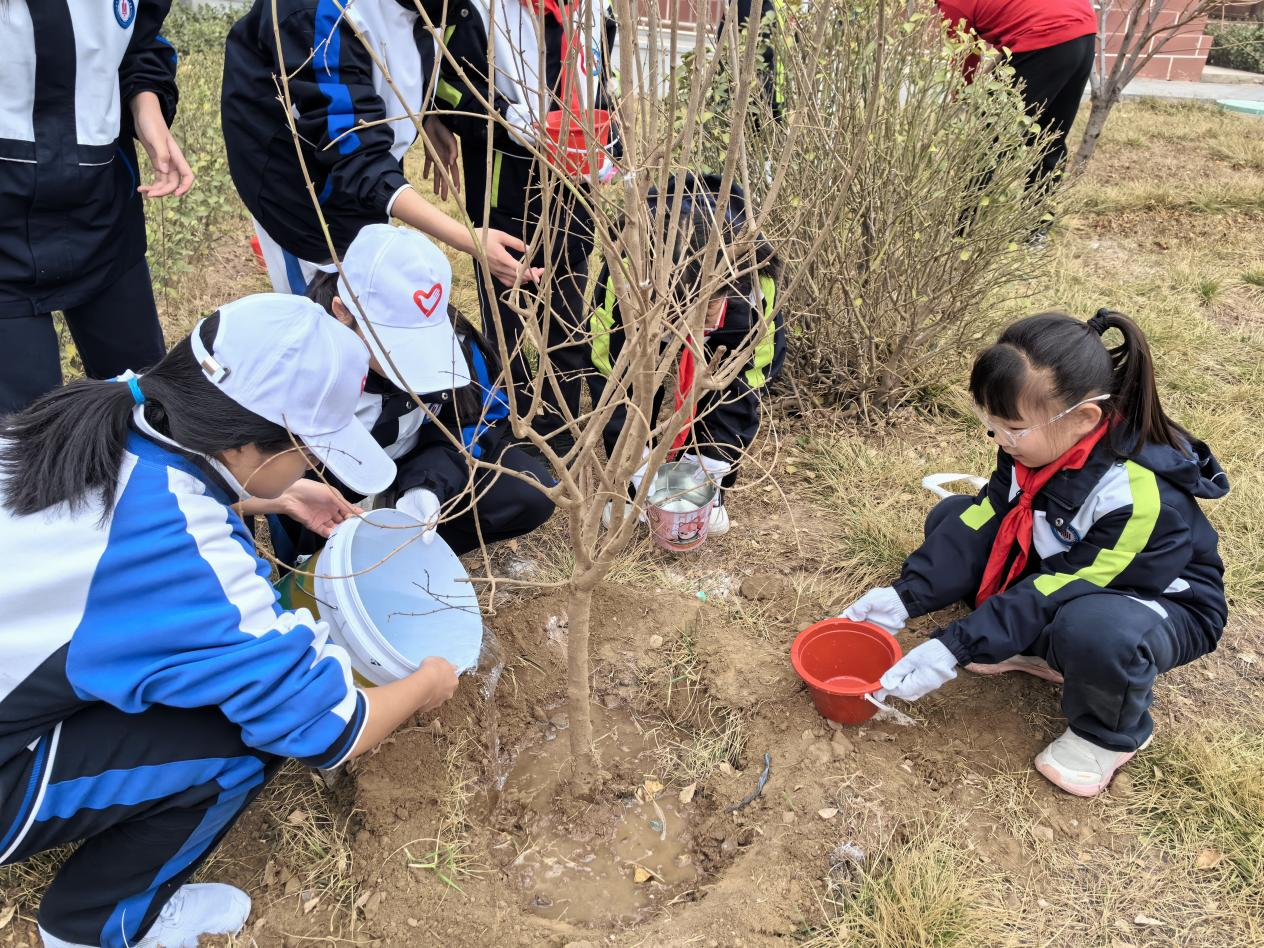 此次活动以“播种绿色希望,共建美丽校园”为主题。现场,“自然导师”用生动易懂的语言讲解植树内容,从树苗生长习性到选地要点,从日常病虫害预防到不同季节浇水频率用量,为后续实践种植打下理论基础。实践环节正式开启,每组人员分工明确、默契协作,挖坑、放置树苗、填土踩实、浇水养护、悬挂名牌……每道工序都包含对绿色未来的憧憬与期待。另一侧,展板上植物知识科普与环保倡议书吸引大家的目光,传递着绿色环保理念。三年级2班邢茁灏亲手种下一株小树苗,成就感满满:“今天我学到很多关于树木的知识,更加了解环保的重要性。我会按时给小树苗浇水、除虫,帮它快快长高。”