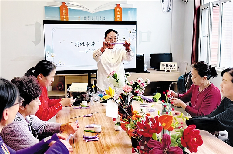 社区活动室举办的绒花制作活动同样忙碌。刘佳老师展示勾条、打尖、传花等技法后,居民们尝试将彩色丝线变成精巧绒花。丝线纤细易缠绕,制作难度不小,但大家没有放弃,在老师指导帮助下逐渐熟练,娇艳的薰衣草绒花在指尖绽放,为活动现场增添一抹亮色。“看到自己亲手做出的绒花,不仅让我找回了儿时的回忆,更感受到社区对居民文化生活的用心和关怀。”居民崔淑敏开心地说。